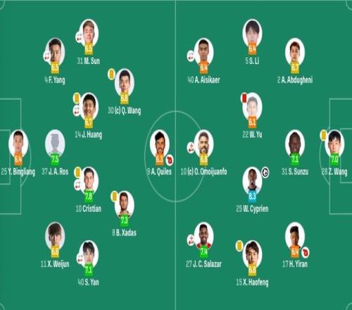 前锋:10-奥莫伊胡安弗(F)(82'20-玄智健)、27-胡安-卡米洛(F)(95'29-谭龙)、40-艾菲尔丁(68'21-朴韬宇)