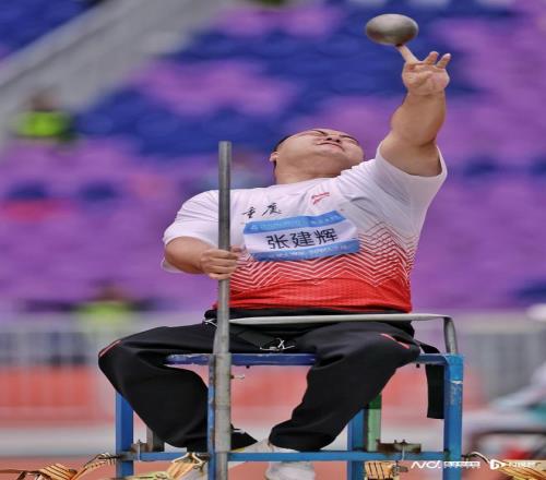 男子铅球F57级决赛,重庆运动员张建辉奋力一掷。
