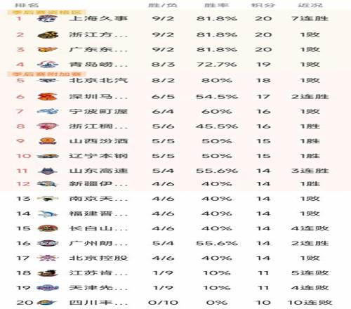 广东目前的战绩是9胜2负,和上海、广厦持平暂列第三名,浙江稠州以5胜6负暂列第8名。昨晚的焦点战还有上海和广厦的强强对决,这场比赛广厦外援布朗继续缺阵,加上和北京的消耗过大,经过四节的较量,以77-99的比分惨败,8连胜的脚步被终结,胡金秋13投10中空砍了22分4篮板。上海多点开花,有6人得分上双,李弘权命中了5记三分,全场贡献了18分8篮板4助攻,洛夫顿18分7篮板6助攻。上海目前豪取7连胜,是目前联盟最长连胜,同时排名升第一。