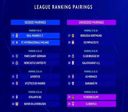 附加赛的对阵依据球队在欧冠联赛阶段的最终排名来决定: