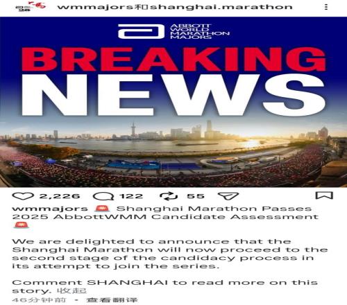 世界马拉松大满贯社交媒体宣布,上海马拉松成功通过第一阶段评估。