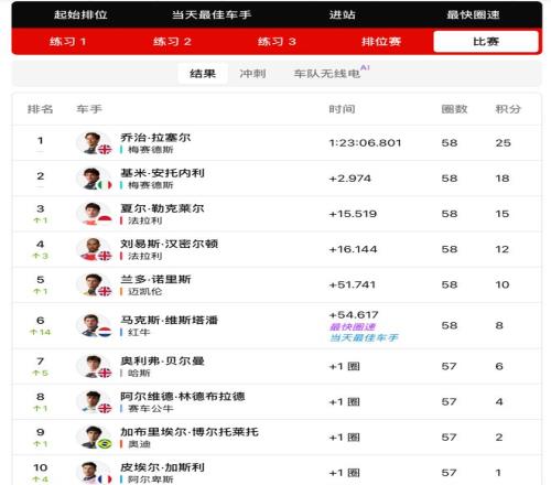 紧接着的正赛中,拉塞尔一路稳健领先,最终摘得本站冠军,新秀安东内利也惊艳地收获亚军席位,而法拉利车队的勒克莱尔则最终拿下季军。