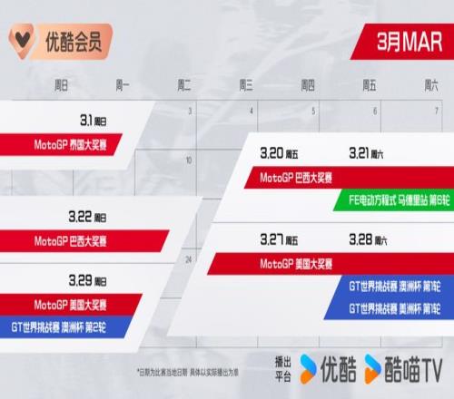 2026年,赛车盛宴轰鸣启幕! 优酷体育携三大赛事重磅来袭:3月20日,MotoGP巴西大奖赛;3月21日,FE电动方程式马德里站;3月28日,GT世界挑战赛澳洲杯第一轮。