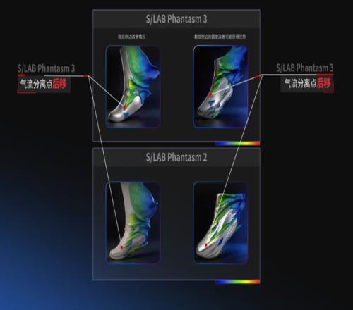 而在气流形态的可视化画面中可以看到,包裹脚踝的护罩结构确实起到了作用:气流从鞋面流经脚踝时,不再是突然分离形成涡流,而是更平滑地过渡过去。鞋身圆润的轮廓也让气流分离点后移,从而减少了后端压强产生的阻力。