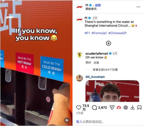 F1 社媒发文玩梗“上海国际赛车场的水指定有什么特别之处”