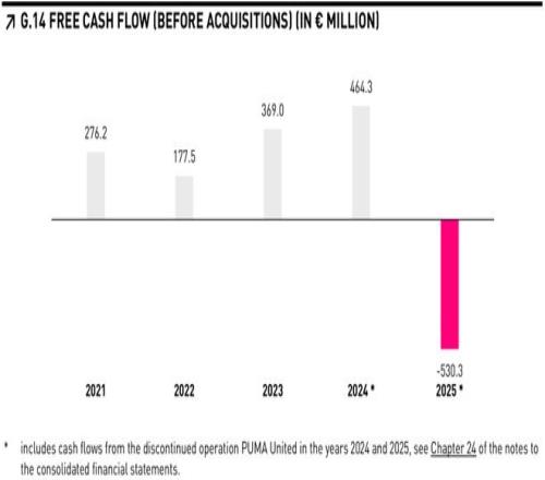 截至2025年底,彪马库存规模达到约20亿欧元。公司不得不通过折扣渠道与批发伙伴清理库存清理,以优化产品结构。库存压力叠加渠道调整,使现金流承受较大压力,公司在年内还签署了过桥贷款以补充流动性。