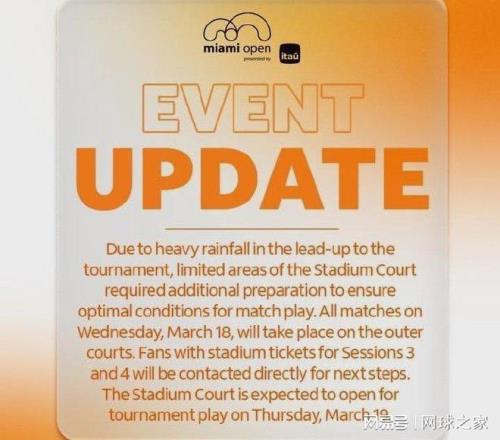 北京时间昨晚,原定开打的ATP1000迈阿密大师赛和WTA1000迈阿密站第二个比赛日的比赛,因为遭遇大雨侵扰,所有比赛都被推迟,最终因雨下个不停而被迫取消。