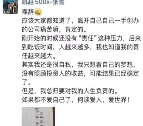 2024年3月的时候,张雪忽然对外宣布,自己已经辞职离开了凯越,他说,离开自己一手做起来的公司,这个决定肯定是很痛苦的,不过因为他和投资人因理念问题产生了分歧,所以离开。