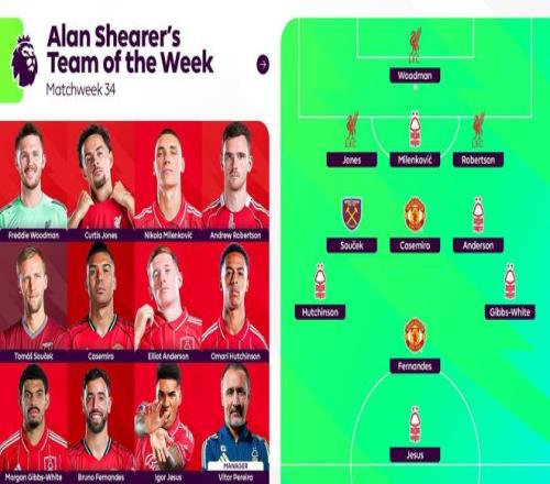 英超官方发布了阿兰-希勒评选的本周最佳阵容,诺丁汉森林五名球员入选,布鲁诺-费尔南德斯、卡塞米罗、罗伯逊、伍德曼等人在列。