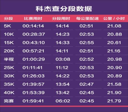 “如果比赛在41公里结束,我会很开心。最后时刻,我的腿真的不行了。”科杰查赛后笑着说,脸上几乎无忧无虑,让人看不出他刚经历了竞技史上最大的遗憾之一。他的收获远不止于此:28岁,比萨维更年轻,跑出史上最快的首马成绩。萨维的首马是2:02:05,基普乔格是2:05:30,贝克勒是2:05:04,而科杰查的首马是1:59:41。